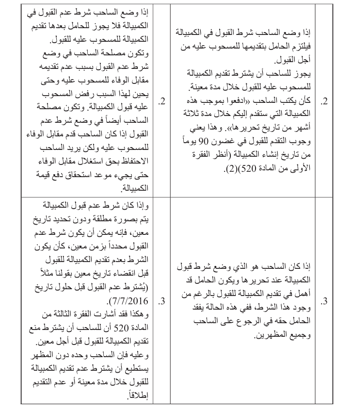 1) إذا شطب المسحوب عليه قبوله المكتوب على الكمبيالة قبل ردها اعتبر القبول مرفوضاً، ويعتبر الشطب حاصلاً قبل رد الكمبيالة ما لم يثبت العكس.