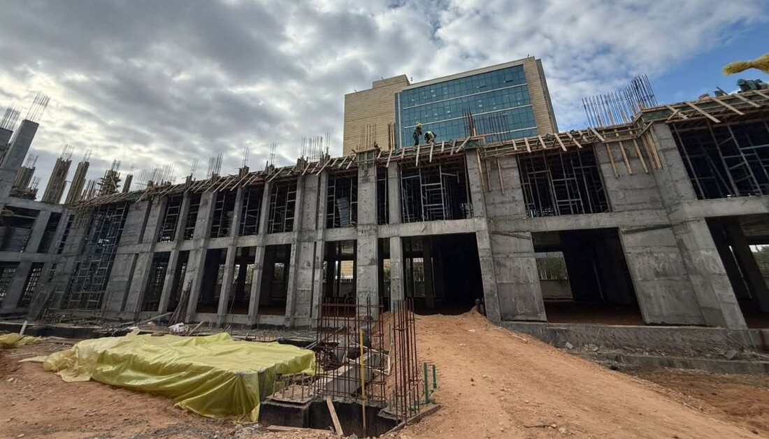 وأوضح أن "المشروع يشهد تقدما ملحوظا في عدة محاور إنشائية، من بينها البناية الطرفية حيث تم إنجاز أعمال صب سقف الطابق الأول بكمية خرسانة تقارب (300) م3، وكذلك البناية الوسطية (بهيئة حرف T)، حيث تم المباشرة بتنصيب سقالات القالب الخشبي لسقف الطابق الثاني، مع الاستمرار بأعمال صب أعمدة وجدران المصاعد".