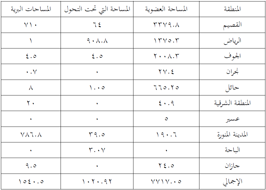 جدول يوضح مساحات المزارع العضوية واخرى التي تحت التحول في المملكة العربية السعودية بالهكتار لعام 2011م