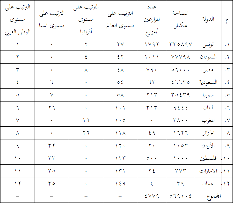ويوضح الجدول التالي مساحات الاراضي الزراعية وايضا عدد المزارعين في الزراعة العضوية في الوطن العربي وترتيبها على مستوى الوطن العربي والعالم في عام 2011م.