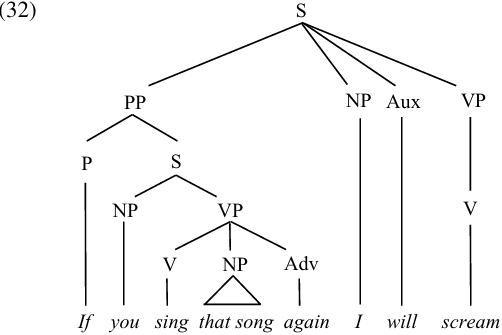 There are other “subordinating conjunctions” in English, including because, while, if, unless, although, etc., which only introduce adjunct clauses; they do not take NP objects like normal prepositions. In order to have a single, consistent treatment for all adjunct clauses, we will assume that these conjunctions also belong to the category P. It may seem odd to call something a preposition that never appears in a “normal” prepositional phrase (i.e. never takes an NP object). But we face a somewhat similar situation with verbs: some take NP objects (31a,b); others take clausal complements (31c,d); while still others can take either (31e,f) or both (31g).We are analyzing because, while, if, etc., as prepositions which take only clausal objects, similar to verbs like realize (in the sense illustrated in (31c,d)).2 A sample tree structure with an if clause is given in (32).