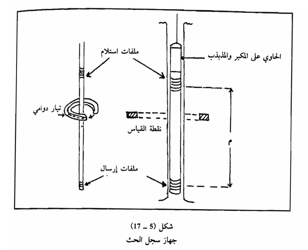 الشكل (5 - 17) يوضح تخطيطاً مبسطاً لنظام تسجيل التوصيل ويتكون من ملف إرسال (Transmitter Coil) وملف استلام (Receiver Coil) ربطا على قضيب عازل والمسافة بين الملفين هي المسافة «L» في الشكل المذكور ويرسل تيار متناوب ذو قيمة ثابتة وتذبذب ثابت إلى ملف Transmitter مذبذب (Oscillator) يؤدي المجال المغناطيسي المتناوب الناتج عن هذا التيار إلى حث Induces أحزمة تيار (Current Loops) تسمى أحياناً تياراً دوامياً أو دائرياً (Eddy Current) في التكوين الذي يحيط بالقطب (Sonde) وهذه التيارات بدورها تشكل مجالاتها المغناطيسية الخاصة بها التي تكون قوة دافعة كهربائية يشار لها بعبارة إشارة (Signal) في ملف الاستلام وتتناسب شدة التيار المستحث (Induced) في التكوين مع قدرة التكوين على التوصيل، لذا فإن الإشارة (Signal) التي تحدث نتيجة للحث في ملف التوصيل تتناسب مع درجة توصيل التكوين ولهذا تتناسب عكسياً مع مقاومته إن الإشارات تكبر وتحول إلى تيار مباشر وتنقل إلى السطح حيث تسجل على أجهزة تسجيل.