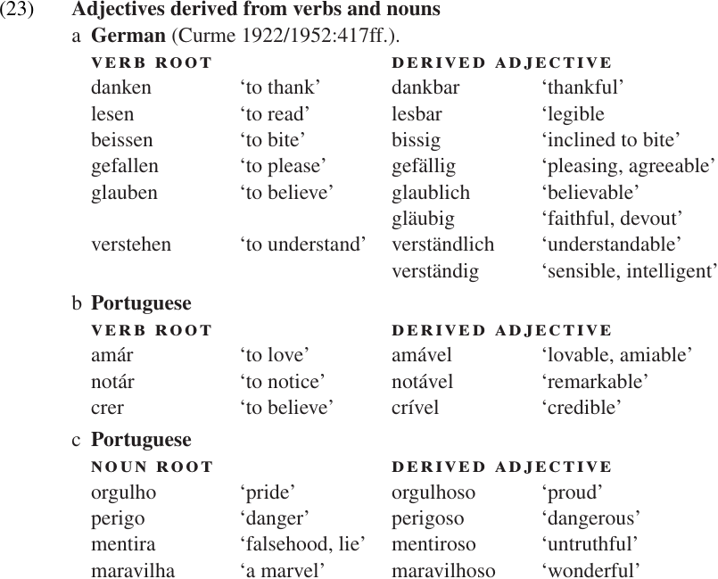 Both German and Portuguese have several suffixes which derive adjectives, either from verbal stems or from nouns. Some examples are listed in (23). Notice that many of the English glosses for the derived forms involve English suffixes which have a similar function, and in some cases are actually historically related (i.e. COGNATE) to the German or Portuguese suffix.