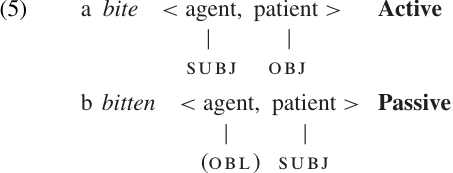 Examples (3a) and (4a) are referred to as active clauses, in contrast to (3b) and (4b), which are called passive. Notice that in both cases the active verb is morphologically simpler than the passive.3 The terms “active” and “passive” are used primarily for clauses which contain a transitive (or ditransitive) verb stem, and refer to specific patterns of Grammatical Relation assignment. In an active clause, like (3a) and (4a), the agent is the subject and the patient is the direct object. In a passive clause, like (3b) and (4b), the patient is “promoted” to become the subject. At the same time, the agent is “demoted” to become an optional oblique argument. In Japanese and Malayalam this is indicated by the use of an oblique case marker; in English, the passive agent is marked with the preposition by. The two configurations are represented in (5), using the English verb bite (active) ∼ be bitten (passive):