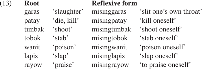 In some languages, these types of relationships are expressed using verbal affixation rather than special types of pronouns. For example, in Kimaragang Dusun (Malayo-Polynesian, northeast Borneo) the prefix pising- is used to form reflexive verbs. Typically, the prefix is added to transitive verb roots, as in example (13). (The reflexive verbs are shown in the normal Active Voice form, which changes the initial p- to m-.) The derived reflexive is intransitive, taking only a single argument, because the same participant f ills both the agent and patient roles. Thus, morphological reflexivization is a detransitivizing, or valence-decreasing, process.