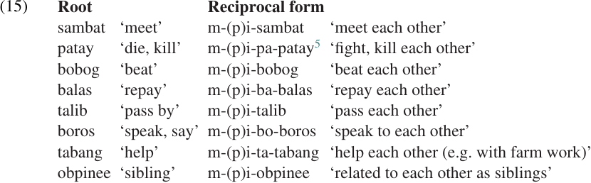 Kimaragang also has a reciprocal prefix, pi-. This is illustrated in (15), again using the active voice form.