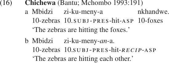 Chichewa is another language which has a reciprocal affix. As (16) illustrates, the suffix–an changes a transitive verb stem into an intransitive reciprocal verb. So reciprocal formation, like reflexivization, is a valence decreasing process.6