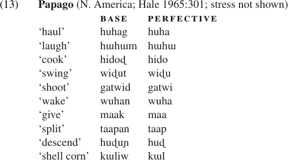 If we consider any single pair in isolation, we might suppose that the base form is created by adding a suffix to the perfective form. But this analysis could require us to recognize as many allomorphs of the perfective suffix as there are consonants in the language (in fact more, under Hale’s analysis), and no way to predict which suffix occurs with which root. By far the simpler analysis is to assume that the perfective is formed by deleting the final consonant of the base form.1
