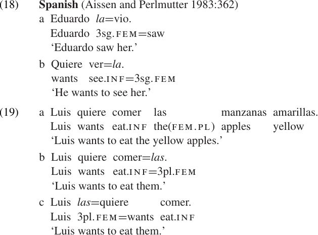 Verbal clitics are clitic particles (normally pronouns) which always take a verb as their host. In Spanish, for example, non-emphatic object pronouns appear as clitics attached to the verb. They occur as proclitics with finite verbs, but enclitics with non-finite verbs (infinitives or gerunds), as illustrated in (18–19). (The alternation in the position of the pronoun observed in (19b, c) Again, the position of these clitics is “special” in the sense that it is different from the normal position of NPs or independent pronouns which bear the same Grammatical Relations.