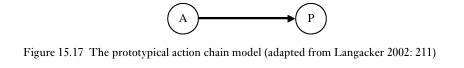 Recall from section 15.2.7 that the term ‘force-dynamics’ relates to our experience of motion energy. This experience gives rise to the knowledge that while some entities have an inherent capacity for energy, other entities only receive energy from external entities. In Langacker’s model, the ‘prototypical action’ is characterised in terms of the transfer of energy from AGENT to PATIENT resulting in a change of state of the PATIENT.As we noted above, this is called the action chain model, and is illustrated in Figure 15.17, where A represents AGENT and P represents PATIENT.