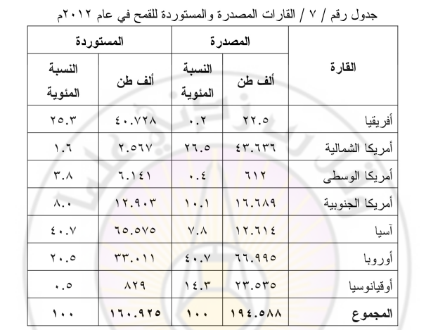 تجدر الإشارة إلى أن الوطن العربي استورد من القمح والدقيق عــام 2012 (36.1) مليون طن بلغت قيمتها أكثر من (10) مليار دولار امريكي، أما معدل الاكتفاء الذاتي من الحبوب فلم يتجاوز (45.7%) في العام نفسه ، حين بلغ متوسط استهلاك الفرد العربي من القمح والدقيق (155.8).