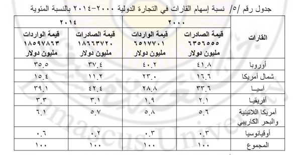6- اختلاف نسبة إسهام القارات والدول في التجارة الدولية، حيث تحتل القارة الآسيوية المركز الأول بين قارات العالم، وتبلغ نسبة مشاركتها فــــي الصادرات نحو 42.4% و 39.1 % في الواردات وتليها دول القارة الأوروبية، فقد بلغ نصيبها نحو 37.4% من الصادرات العالمية و 35.5 % من الواردات بينما تأخرت قارة أمريكا الشمالية إلى المرتبة الثالثة عالمياً، حيث بلغت نسبة صادراتها نحو 11.2 % من الصادرات العالمية و 15.4% من إجمالي الواردات. أما قارتا أفريقيا وأوقيانوسيا فتأتيان بالمترتبة الأخيرة.