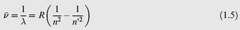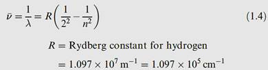 observed in the visible region of the atomic spectrum of hydrogen obeyed equation 1.4, in which R is the Rydberg constant for hydrogen, ῡ is the wavenumber in cm-1, and n is an integer 3, 4, 5 . . . This series of spectral lines is known as the Balmer series.