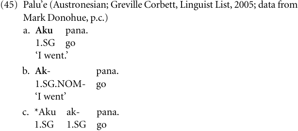 Pronoun > agreement Morphological forms described as agreement markers are, as a rule, the result of processes whereby functional categories having a clear-cut lexical or grammatical function are desemanticized to the effect that they have no more meaning other than signalling syntactic relations across words and phrases, and decategorialized in losing their independent status and becoming clitics or affixes. A paradigm instance is provided by personal subject pronouns which become obligatory clitics or affixes on verbs (see Donohue 2003 for examples in the Skou language of New Guinea). In the Palu’e language of Flores, Indonesia, there is no agreement, and none of the closely related languages has agreement. But Palu’e does have one agreement clitic, the proclitic ak-, related to aku ‘first person singular’ (45a), which can only mark a nominative argument (45b). It is clearly part of the same phonological word as the verb it attaches to, although it has not become an obligatory part of the verb, being exclusory of any free pronoun, cf. (45c).