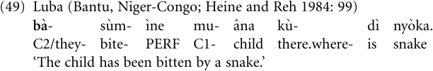 We will deal with this process in more detail in “Treating events like objects”; the following example illustrates the process. In the Ik language of north-eastern Uganda, which has an elaborate paradigm of case inflections, one of these inflections, the dative suffix-ke, has been extended to use as a clause subordinator (Heine 1990; König 2002). Example (44a) illustrates the use of the suffix as a nominal case inflection, while (44b) shows the very case marker being used as a subordinator. That this was a unidirectional process from nominal to clausal inflection is suggested by the fact that the former, but not the latter, can be reconstructed back to Proto Kuliak, the hypothetical ancestor of the family to which Ik belongs.