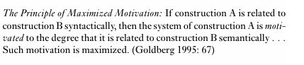 Having set out what kinds of factors govern the relationships between constructions and individual verbs, Goldberg’s next task is to explain what governs the relationships between constructions themselves. As we saw earlier in the chapter, Goldberg, like Langacker, assumes that constructions interact within a structured network of relations rather than comprising an unordered set. In Goldberg’s model, relationships between constructions are captured in terms of motivation and inheritance. Consider the following principle:
