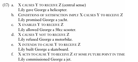 As we saw earlier in the chapter, although examples like these share in common the salient feature of the central sense, they differ in terms of whether the TRANSFER is actual or intended, permitted or prohibited, and so on. Just like lexical polysemy, constructional polysemy can be modelled in terms of a semantic network (recall Chapter 10).