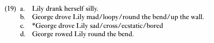 The example in (19a) is an instance of the resultative construction. When the verb drive occurs in this construction, one of a particular set of expressions must fill the result ‘slot’, as in (19b), and the construction takes on an idiomatic reading that can be paraphrased as ‘make somebody crazy’. If the ‘wrong’ expressions are chosen to fill the construction, the result is ungrammatical (19c) or fails to be recognised as the resultative construction (19d) and therefore loses its idiomatic interpretation. The idiomatic construction in (19b), then, is a special case or instance of the ‘ordinary’ resultative construction illustrated by example (19a).