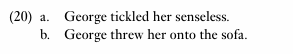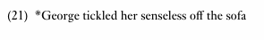 The similarity between these two construction types revolves around the interpretation of the result phrase (the adjective phrase (AP) senseless in example (20a)) as a type of metaphorical GOAL, parallel to the actual GOAL expressed by the PP in the caused motion construction (onto the sofa, in example (20b)). In other words, the resultative construction encodes a metaphorical movement towards a GOAL or a metaphorical change of location. As Goldberg observes, this parallel is further supported by the fact that resultatives do not permit GOAL PP phrases. This can be accounted for by the fact that the result phrase already expresses the (metaphorical) GOAL, so the expression of an additional GOAL is redundant. This is illustrated by the unacceptability of example (21).