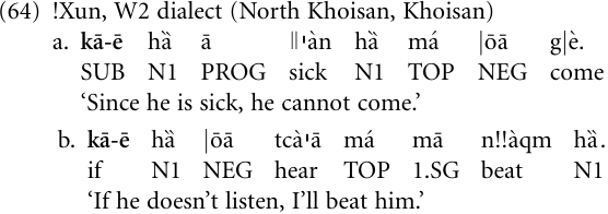 Demonstrative pronouns are a salient source of complementizers (see “The demonstrative channel”); less commonly, however, they may also provide the source for adverbial clause subordinators. A striking example is provided by the southwest African Khoisan language !Xun, where the proximal demonstrative kā ē ‘this (particular one)’, usually reduced to kā-ē, has turned into a general subordinator of adverbial clauses (alternatively, the second proximal demonstrative kā ŋ̄ŋ̄ ‘this’, or simply the personal pronoun kā ‘it’ of noun class 4 (N4), can be used as a subordinator). Depending on the context in which it is used, kā-ē may introduce locative, temporal, causal, or conditional adverbial clauses; the following examples illustrate the causal (64a) and conditional (64b) functions of the subordinator.