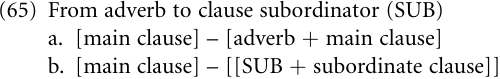 The channels of adverbial clause subordinators sketched above are strikingly similar to the ones that we observed in the case of complementizers (“Complement clauses”; see also “Clause subordination Discussion”). But there are also channels that appear to be restricted to the former. This applies most of all to the channel leading from adverbs to subordinators. It is spatial and temporal adverbs in particular, such as ‘here’, ‘there’, ‘now’, ‘then’, etc., that provide a common source for adverbial subordinators. When this channel is used, adverbs grammaticalize into adverbial subordinators (SUB). The kind of construction involved typically takes a form as in (65a) which is reinterpreted as (65b).