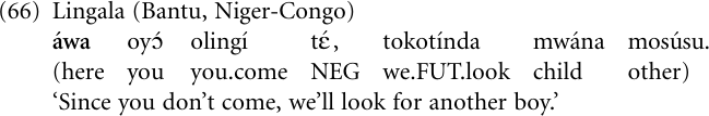 Once again we are dealing with a process whereby a lexical item (in this case an adverb) is reinterpreted as a functional category, and a main clause as a subordinate adverbial clause. In the Central African Bantu language Lingala, the locative adverb a̒wa ‘here’ provided the source for the temporal conjunction ‘while’, ‘when’, and further for the causal subordinator a̒wa ‘since’, ‘because’, for example: