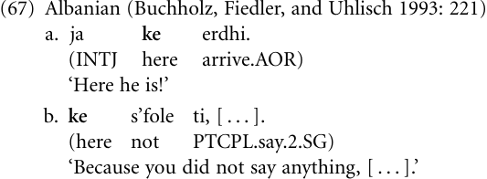 Similarly, the Albanian adverb ke ‘here’ (67a) appears to have provided the source for a conjunction marking a causal clause (67b).