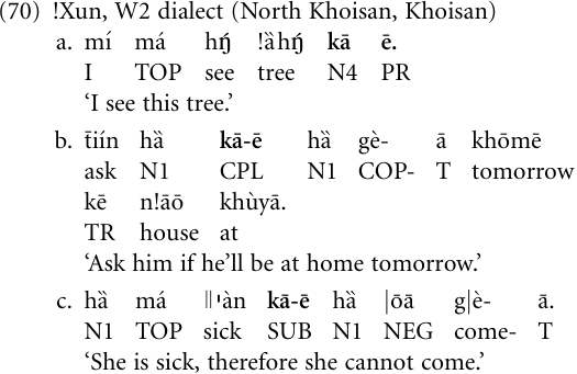 One piece of evidence is provided by the diachronic criterion: As we will see in “Clause Subordination Case studies”, there are historical data to show that relativizers and complementizers can develop further into adverbial clause subordinators. A second piece of evidence comes from crosslinguistic observations on grammaticalization. A number of languages have reached stage (68b) but not (68c), that is, a demonstrative has been grammaticalized to a complementizer but not to an adverbial clause subordinator. English is such a language: It uses the item that as a demonstrative pronoun (69a), as an object complementizer (69b), and a subject complementizer (69c), but essentially not as an adverbial clause subordinator. In the Khoisan language !Xun, all stages of (68) are represented: In (70a), the form kā ē is a proximal demonstrative modifier of noun class 4 (‘this’), in (70b) it is an object complementizer, while in (70c) it is an adverbial-clause subordinator—more specifically a reason conjunction, but it has a number of other subordinating functions in addition, such as marking temporal and conditional clauses.