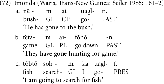 In (71a) there is a nominal locative complement marked by an allative adposition or case affix, as in example (72a) from the Papuan language Imonda, where the allative marker consists of the nominal goal suffix-m (GL). In (72b), the locative complement is conceived of as an activity, irrespective of whether it is encoded by a noun, as in (72b), or as a nominalized verb (see below). Finally, in (72c) the erstwhile locative complement is now a verb that may take complements and is conceived of as expressing the purpose of the motion.