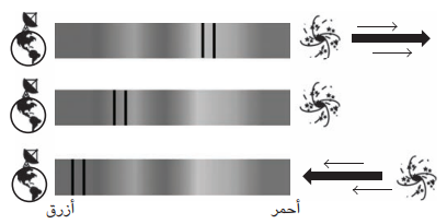 مستويات الطاقة الموجودة في ذرات الكالسيوم اعتمادًا على موقع الذرة، ومن ثُمَّ ينبغي أيضًا ألا تختلف الأطوال الموجية للضوء الممتص ومع ذلك، عندما ننظر إلى طيف مجرة أندروميدا، نجد أن خطوط الكالسيوم قد انحرفت عن مكانها المتوقع بمقدار بضعة أجزاء من المليار متر في الطول الموجي. ونظرًا إلى أن خطوط الامتصاص قد انحرفت إلى أطوال موجية أقصر مقارنةً بأطوالها الموجية على كوكب الأرض؛ أي انحرفت نحو الطرف الأزرق من الطيف الكهرومغناطيسي، فإننا نقول إنها قد تعرضت إلى انزياح أزرق. يبدو الأمر كما لو أن الكالسيوم الموجود في مجرة أندروميدا يمتص فوتونات ذات أطوال موجية مختلفة بعض الشيء، وأن الإلكترونات الموجودة في ذرة الكالسيوم مرتبة على نحو مختلف هناك، ولكن لماذا تختلف العناصر الكيميائية بهذا الشكل؟ حسنًا، إن قوانين الكيمياء لا تتغير، وإنما ما يتغير هو الكيفية التي نرى بها الضوء القادم من المجرة.