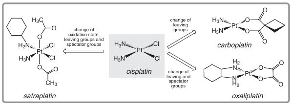 Figure 9.3 Evolution of the first-generation platinum drug cisplatin into later generation drugs.