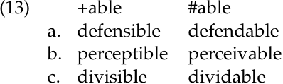 Forms with +able in (13) exhibit allomorphy in the stem. They use a form that is recognizable from nouns, namely defense, perception, and division, instead of the citation form of the lexeme: defend, perceive, and divide. The fact that +able can be spelled +ible is unimportant here. Further examples of stem allomorphs occurring with the primary affix +able are given in the leftmost column of (14):