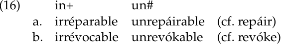 In talking about the distinction between primary and secondary affixes, we have focused on suffixes. Prefixes can be primary or secondary as well. An example of a primary prefix is in+, and an example of a secondary one is un#. Both mean ‘not’. Phonologically, in+ has allomorphs. It surfaces as ir-, im-, in-, and il- in words like irreplacable, immortal, inoperable, and illegal. Un# does not have any allomorphs. Un- is of Germanic origin, with cognates in earlier stages of English, in contrast to in-, which came to English from Latin, through French.