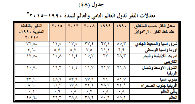 وفضلا عن ذلك ، نلحظ ان سكان الأحياء الفقيرة ذات مستويات تعليم أدنى ومعدلات خصوبة أعلى من غيرهم ، اذا ما قورن مع سكان المناطق الحضرية ، وهم أكثر تأثرا بالكوارث البيئية والتلوث غير أنه في معظم البلدان النامية تعتبر ظروف معيشة سكان المناطق الريفية أسوأ لاسيما وضعهم الصحي وكذلك معدلات الوفيات مرتفعة كما أن الفقر لا يزال متركزا إلى حد كبير في المناطق الريفية حيث تعيش نسبة 75% من فقراء العالم تشير الاحصاءات الرسمية بان ما يقارب 400 مليون نسمة يعيشون في ظروف الفقر ، وان نقص العمل يعد أحد العوامل الاساسية والمباشرة في ذلك ، ففي عام 2000 بلغ عدد الفقراء الحضريين حوالي مليار نسمة ، وتمثل 80 % منهم في البلدان النامية لاسيما في دول اسيا وافريقيا وامريكا اللاتينية ويتضح من الجدول (48) حالة الانخفاض الواضح في معدلات الفقر منذ تسعينيات القرن العشرين وحتى القرن الواحد والعشرين الحالي ، وهذا راجع لجملة القرارات السياسية فضلا عن التحولات الصناعية للعديد من البلدان مما اسهم في استقطاب العمالة المحلية وبالتالي انتشالهم من حالة الفقر الى حياة معاشية اكثر استقراراً .