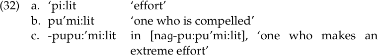 We see in (32c) that the reduplicated syllable pu- includes the vowel of the infix -um-. This tells us that in this construction, infixation precedes reduplication. If reduplication had preceded infixation, we would have expected the non-occurring form *pumi:pi:lit.