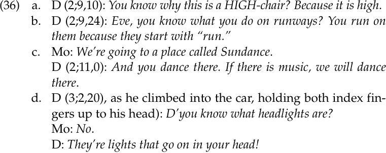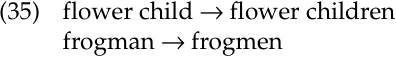 The fact that the plural of flower child is flower children instead of *flower childs means that speakers apply the pluralization operation to the head of the compound, child, which has an unproductive, irregular plural ending, instead of to the compound as a whole. Similarly, to pluralize frogman, you pluralize its head, leading to frogmen. Head operations are possible because word-level morphology is a two-way street where creation of word forms is as much a part of the human language faculty as is their analysis. Again, we can cite evidence for this from child language acquisition. Clark (1993: 404) uses the examples below to illustrate that, at an early age, children are able to analyze the complex word forms that they hear: