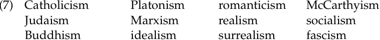 Let’s take the English suffix -ism. This affix has some very highly lexicalized meanings, one of which is ‘doctrinal system of principles’. We find this meaning in words like the following, and many others having to do with religion, philosophy, science, politics, or the arts: