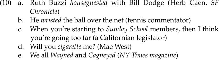 While sand is well established as a verb, zero-derivation is a productive derivational process in English (cf. 4.2.2), as shown by the following nonce forms presented by Clark and Clark. All of these sentences are actual quotations:
