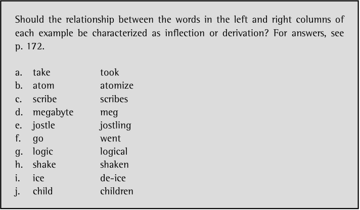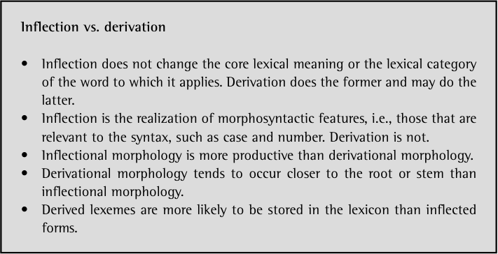 The first question we can ask about the distinction between inflection and derivation is whether there is any formal basis for distinguishing the two types of morphology. Can we tell them apart because they do different things to words?