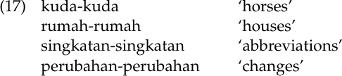 2 Sneddon (1996: 17) notes further, “It is sometimes stated that reduplication of nouns indicates variety rather than plurality (although plurality is implied by variety). Indonesian writers disagree on this question, but clearly reduplication can be used where variety is of no importance.” As evidence, he uses the examples that we have given in (18).