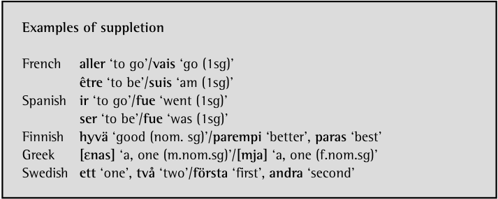 The last type of inflection presented here is suppletion. Suppletion is said to take place when the syntax requires a form of a lexeme that is not morphologically predictable. In English, the paradigm for the verb be is characterized by suppletion. Am, are, is, was, were, and be have completely different phonological shapes, and they are not predictable on the basis of the paradigms of other English verbs. We also find suppletion with pronouns. Compare I and me or she and her. Suppletion is most likely to be found in the paradigms of high-frequency words, as seen in the following box.