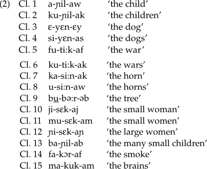 The Kujamaat Jóola definite article has the form -aC, where C is identical to the consonant of the class prefix. Three noun classes have prefixes that consist of a single vowel: class 1 (a-), class 3 (ε-), and class 8 (u-). For these, the definite article has the form -aw, -εy, and -aw, respectively. Examples from Sapir (1965: 68) are given in (2):