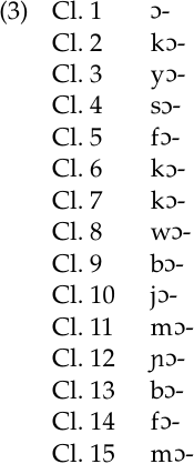 The form of first and second person pronouns does not depend on noun class. Third person pronouns do. Both subject and object pronouns have the shape Cɔ when free (as opposed to bound), with C corresponding to the consonant of the noun class prefix. The forms of third person pronouns for classes 1–15 are listed in (3):
