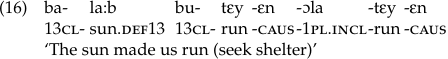 As we mentioned, the causative typically expresses the meaning ‘cause to do something’ or sometimes ‘allow, persuade, help to do something’. We illustrate it with an example from Kujamaat Jóola. On its own, the stem tεy- means ‘run’. When suffixed with the causative marker -εn, however, it means ‘make run’: