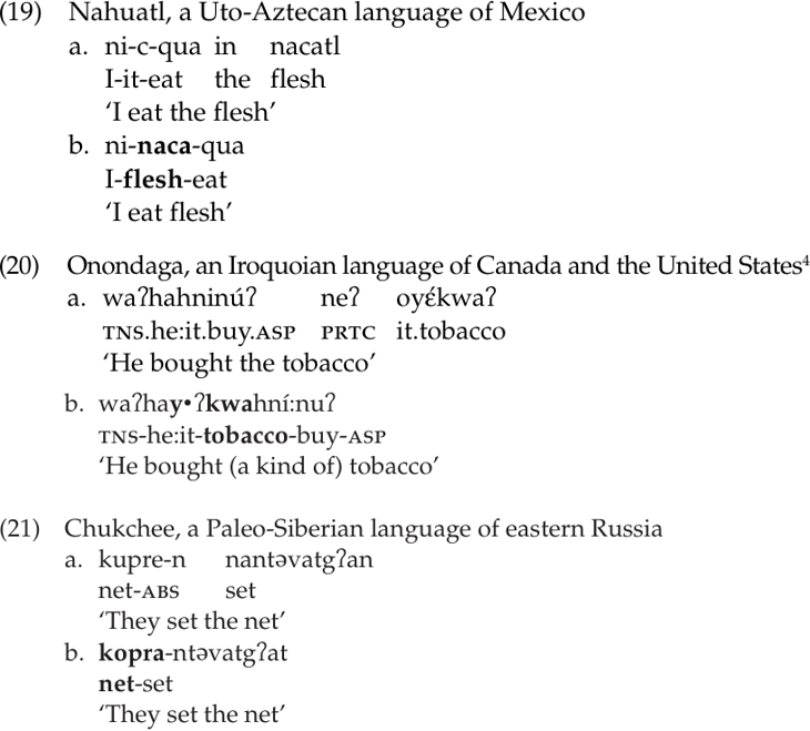 The last type of grammatical-function-changing phenomenon that we illustrate here is noun incorporation. Gerdts (1998: 84) defines incorporation as “the compounding of a word (typically a verb or preposition) with another element (typically a noun, pronoun, or adverb). The compound serves the combined syntactic function of both elements.” Noun incorporation is the most common type. It involves the combination of a noun stem and a verb or adjective into a complex derived verb stem. The following examples all illustrate noun incorporation. They are from Gerdts (1998: 84–5), who cites Sapir (1911), Woodbury (1975), and Comrie (1992), respectively. We have put the incorporated noun stems in boldface type.
