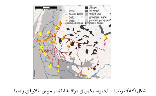 رسم خرائط الأمراض أمر حاسم في علم الأوبئة تشمل الأمثلة الحديثة رسم خرائط حالات -19 -COVID لتحديد النقاط الساخنة وتوجيه عمليات الإغلاق أو تخصيص الموارد استُخدم الجيوماتكس على نطاق واسع خلال جائحة كورونا من لوحة Johns Hopkins العالمية للحالات (GIS) عالمي إلى التحليل المحلي للانتشار بالنسبة لأنماط التنقل في مكافحة الملاريا، تستخدم دول مثل زامبيا GIS لتوجيه الرش وتوزيع الناموسيات عبر رسم خرائط للقرى ومعدلات الإصابة لتحسين التدخلات في الصحة البيئية، يساعد الجيوماتكس في دراسة الارتباطات، مثل تحليل ما إذا كانت المجتمعات القريبة من المواقع الصناعية لديها معدلات مرض أعلى عبر تراكب بيانات الصحة مع مصادر التلوث.