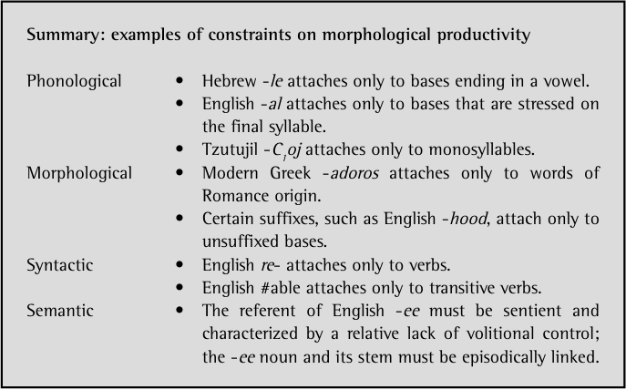 Productivity can also be constrained by semantic factors. Barker (1998) studies the English suffix -ee found in words like advisee, addressee, enlistee, or employee using a large set of naturally occurring examples such as the following (p. 720):