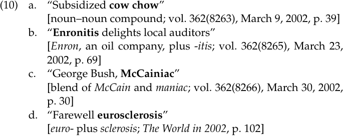 Novel words are called nonce forms or hapax legomenona, and they are particularly common in contexts where salience counts, such as advertising or journalism. One way to create a catchy headline is to include a recognizably novel word. The following examples are all from The Economist (emphasis ours):