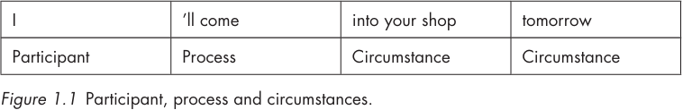 The kind of meaning expressed by these elements of semantic structure is representational meaning, or meaning that has to do with the content of the message. The various types of process, participants, attributes and circumstances are outlined and described more fully in “Conceptualizing patterns of experience: processes, participants, circumstances”.