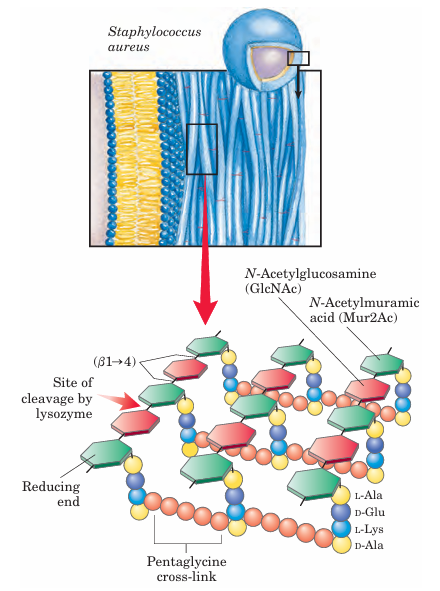 FIGURE 7–22 Peptidoglycan. Shown here is the peptidoglycan of the cell wall of Staphylococcus aureus, a gram-positive bacterium. Pep tides (strings of colored spheres) covalently link N-acetylmuramic acid residues in neighboring polysaccharide chains. Note the mixture of L and D amino acids in the peptides. Gram-positive bacteria have a pentaglycine chain in the cross-link. Gram-negative bacteria, such as E. coli, lack the pentaglycine; instead, the terminal D-Ala residue of one tetrapeptide is attached directly to a neighboring tetrapeptide through either L-Lys or a lysine-like amino acid, diaminopimelic acid.